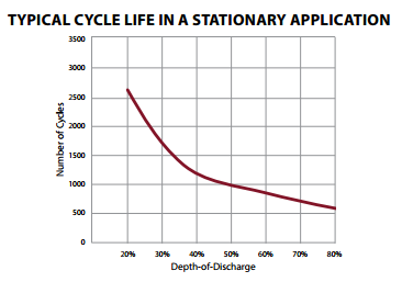 This following chart3) shows DoD vs expected duty cycles. In an offgrid scenario we will assume the bank is cycled every night. If the bank is drained to the usual 50% DoD the bank4) is predicted to last 1000 cycles, or about 3 years. If the bank cycle is shallower to 20% DoD the bank is expected to last 2500 cycles, or about 7.5 years. If the bank is deeply cycled to 80% DoD the bank is expected to last 500 cycles, or about 1.5 years.