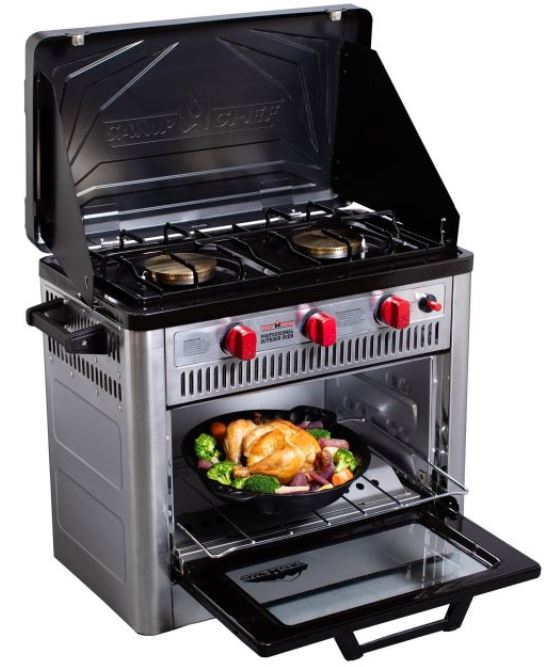 For those who do like having a real oven but need something smaller than the common RV size, the Camp Chef camping ovens have some popularity due to their relatively compact size at only 12“ deep and 20” wide (if you take the handles off). However because they are built to be lightweight and portable, they are extremely flimsy. They rattle and shake and buzz endlessly, no matter how smooth the road that you're driving on is. Long-term reliability is also questionable with the flimsiness of the construction, and they use a weird proprietary propane fitting that can be fiddly to adapt onto and sticks far off the back (making them need more depth than they should).