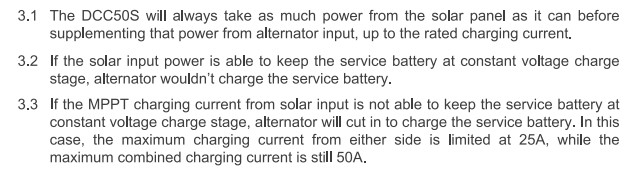 Like the Renogy DCC30 and 50, when charging from both sources each can only output 1/2 the rated current (25A solar, 25A alternator, for example).30)