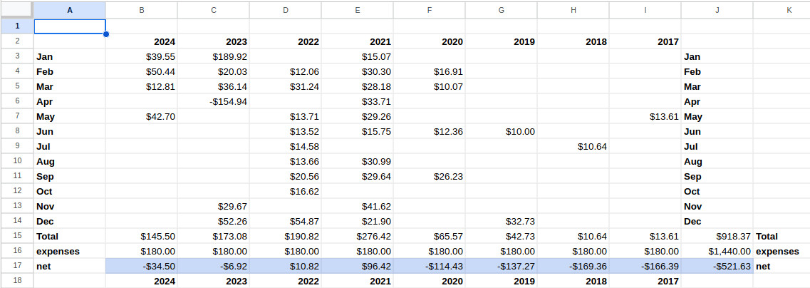 2. the gap and negative number in 2023 is because a $154.94 was awarded then the buyer returned the product a couple months later. The deduction slurped up all other commission earnings for a few months